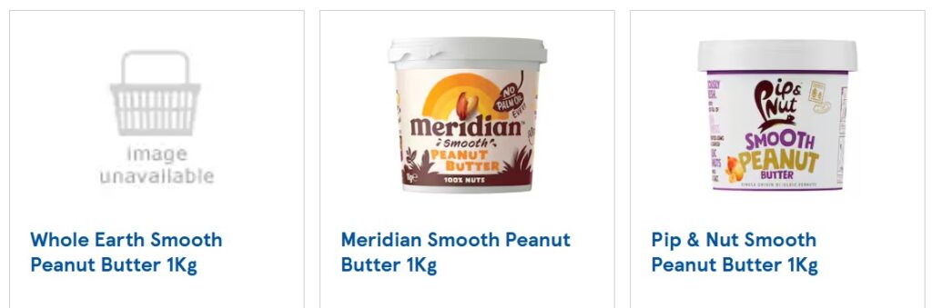 In product marketing, decent quality images are essential. Without them, you’ll struggle to sell. Look at the example below, notice how the product on the left is less appealing because there is no product image. The neighbouring product images show familiar branding and packaging to entice customers to click and buy.